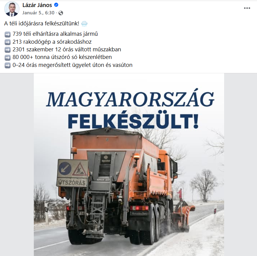 Lázár János oldaláról is ment a „jelentés”: szerinte „folyamatosan úton vannak a gépek”, latyakos-hókásás a burkolat több gyorsforgalmin, a fő- és mellékutak havasak-latyakosak, a vasút „tartja magát”.