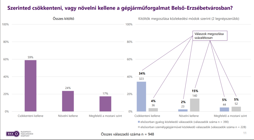 A válaszok szerint a gépjárműforgalmat összesítve 59% csökkentené, 24% növelné, 17% szerint megfelelő a mostani szint.