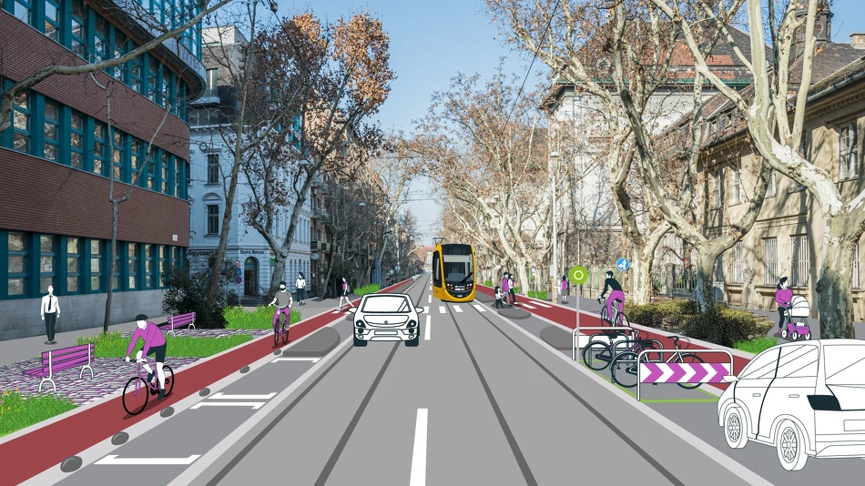 A kommunikációban a cél a „zöldebb, élhetőbb” utcakép – de a tervekben nagyon egyértelműen megjelenik az is, hogy az átmenő gépjárműforgalmat csökkenteni akarják.