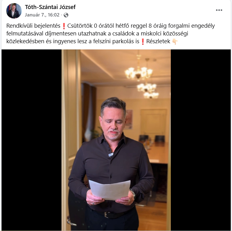 A közlemények szerint 2026. január 8. (csütörtök) 0:00-tól 2026. január 12. (hétfő) 8:00-ig Miskolcon a közterületi, felszíni parkolás díjmentes.