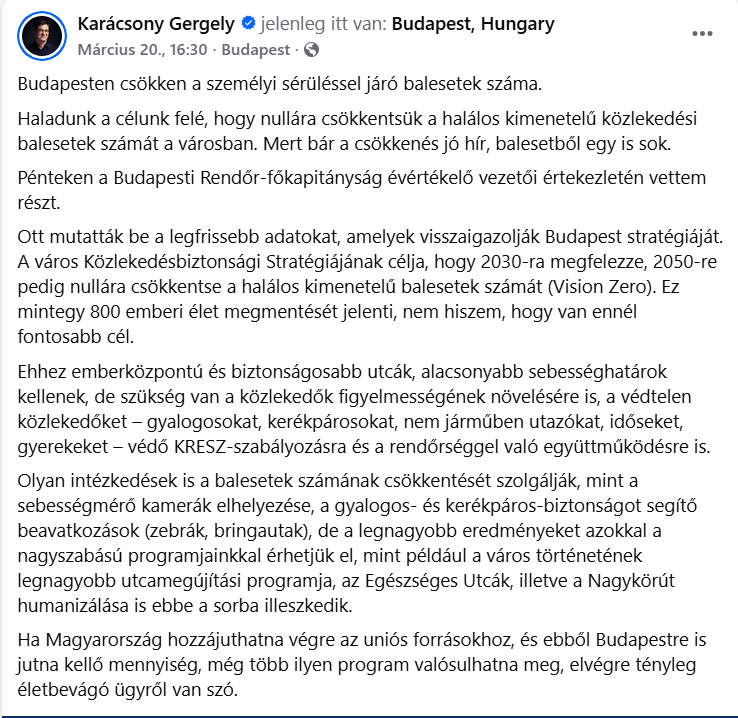 A főpolgármester megint egyetlen sikerjelentésbe pakolt bele mindent: traffipaxot, zebrát, bringautat, alacsonyabb sebességhatárokat, Egészséges Utcákat, Nagykörút-átalakítást és az uniós pénzeket is.