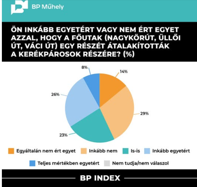 A megkérdezettek 43 százaléka inkább vagy teljes mértékben nem ért egyet azzal, hogy a főutak, így például a Nagykörút, az Üllői út vagy a Váci út egy részét átalakították a kerékpárosok részére.