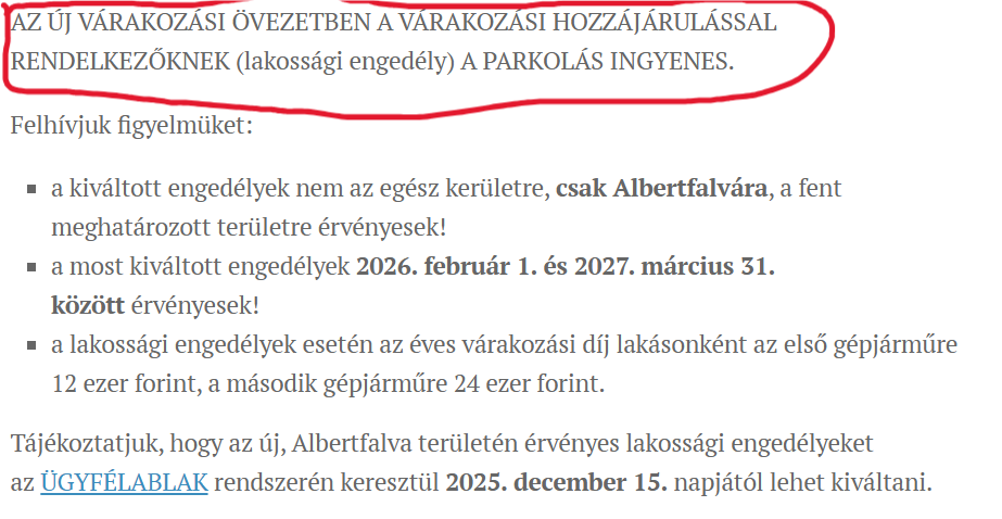 2026. február 1-től Albertfalván is fizetni kell a parkolásért a Galvani út – Andor utca – Egér út – vasút – Kitérő út – Szerémi út által határolt részen, hétköznap 8 és 18 óra között.